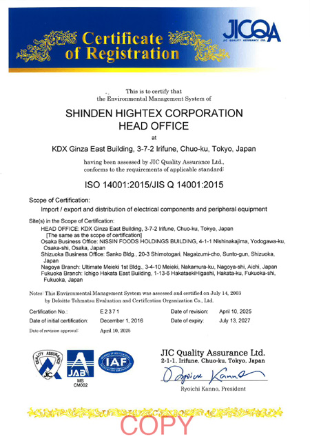 ISO 14001 is an environmental management system (EMS). This is an international standard for environmental activities. This is a "part of the overall management system and includes the organizational structure, planning activities, responsibilities, practices, procedures, processes and resources in order to create, implement, achieve, review and maintain an environmental policy." Shinden Hightex is promoting corporate activities that are friendly on the global environment.